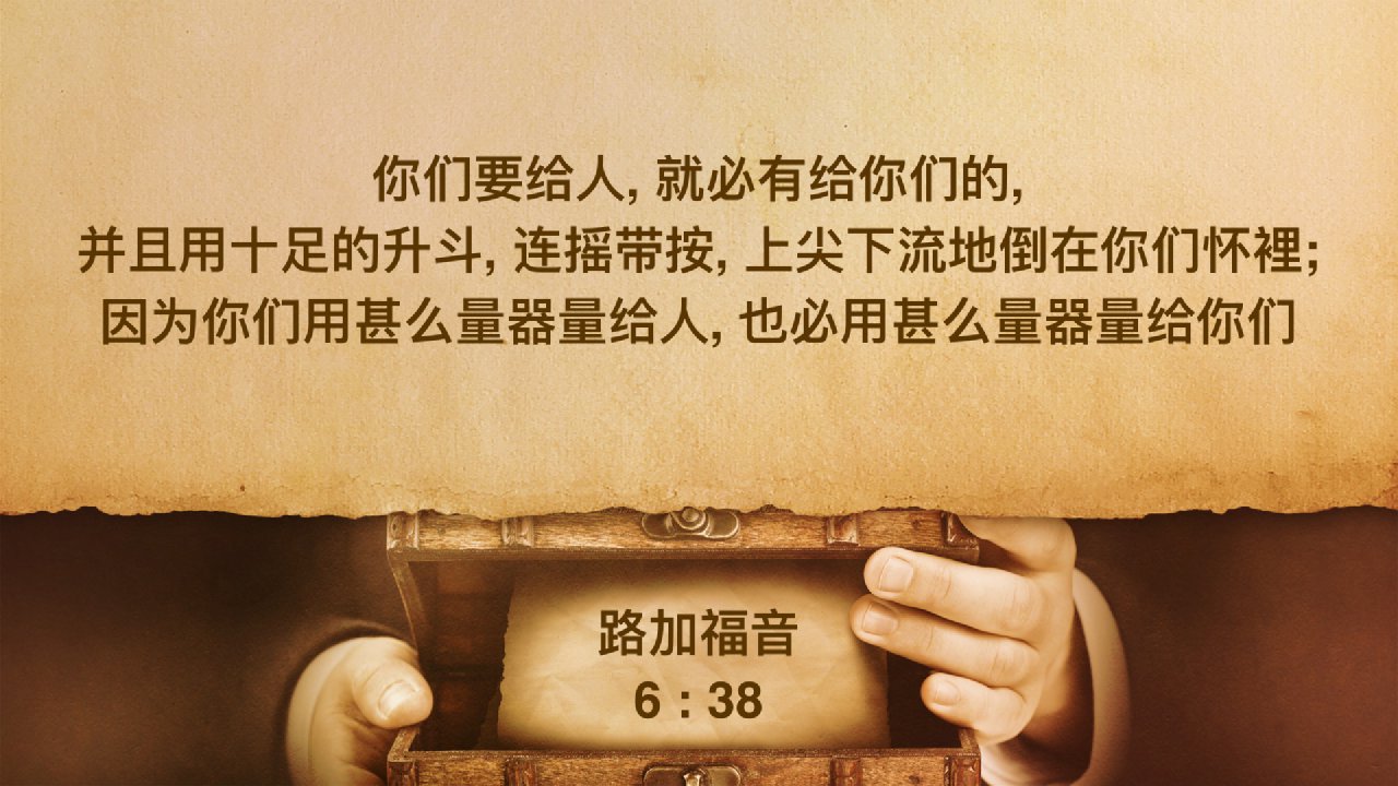 「你們要給人,就必有給你們的,並且用十足的升斗,連搖帶按,上尖下流地倒在你們懷裡;因為你們用什麼量器量給人,也必用什麼量器給你們。」(路六38)